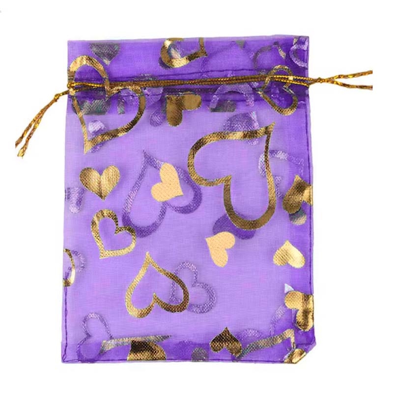 Organza - chiffonpose med guld hjerter. 90 mm. Lilla. 100 stk.