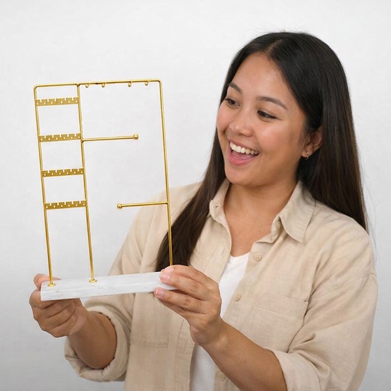 Dette smykkestativ til øreringe med mere, er det perfekte tilbehør til at organisere og vise dine smykker. Med dets elegante "Guld" design og marmor sokkel vil det tilføje stil og elegance til ethvert rum.